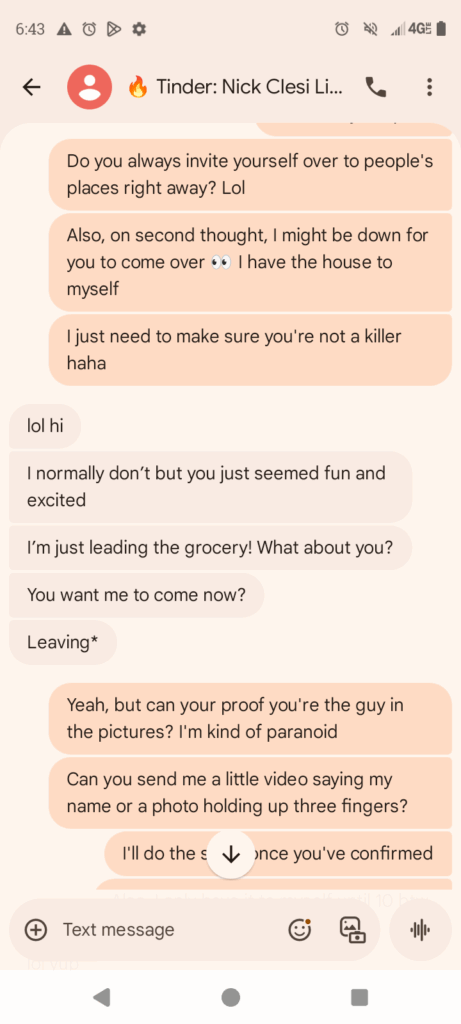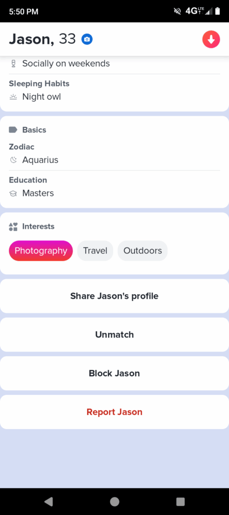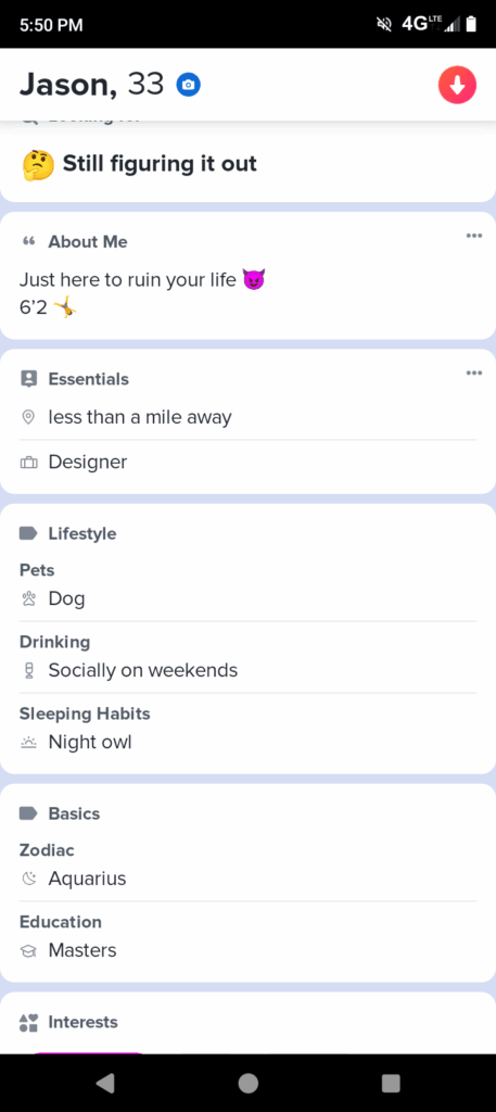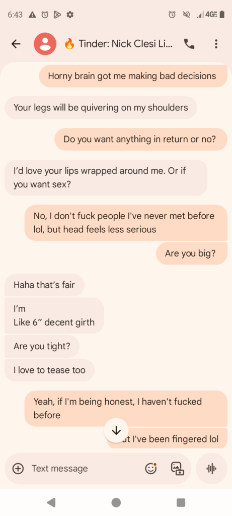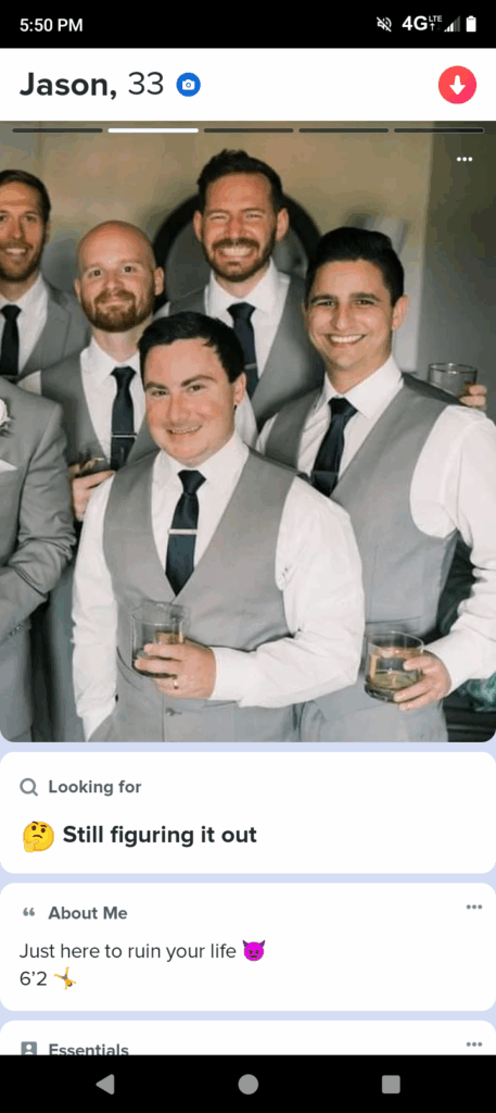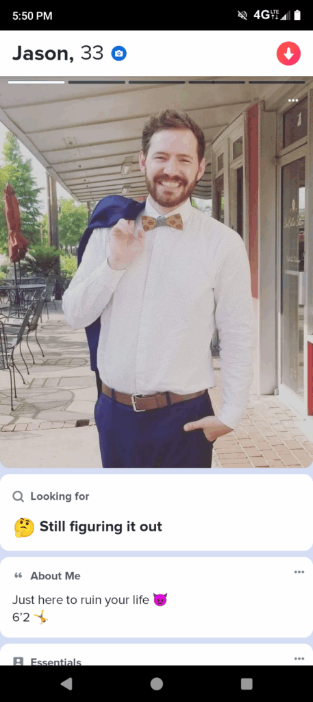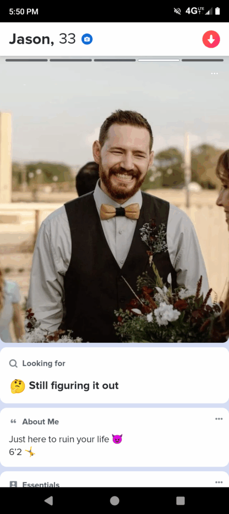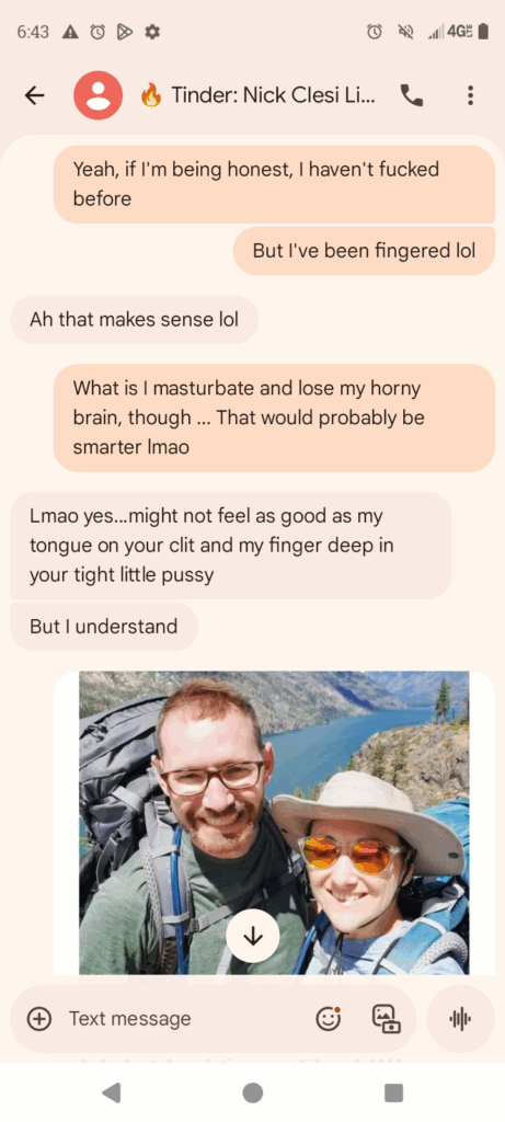 “This dude is on Tinder going by the name ‘Jason’ despite being married to Abigail Comeau. He almost immediately invites himself over to eat strangers’ pussies. Screenshots of his profile and the chat coming up!”